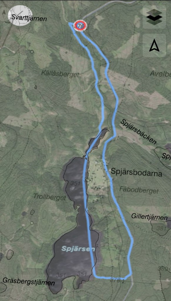 Första biten innefattar en härlig utförslöpa genom skogen, åtminstone om det inte är isigt i spåret. Sen kommer man ut på några små myrar för att så småningom komma ut på Spjersen.