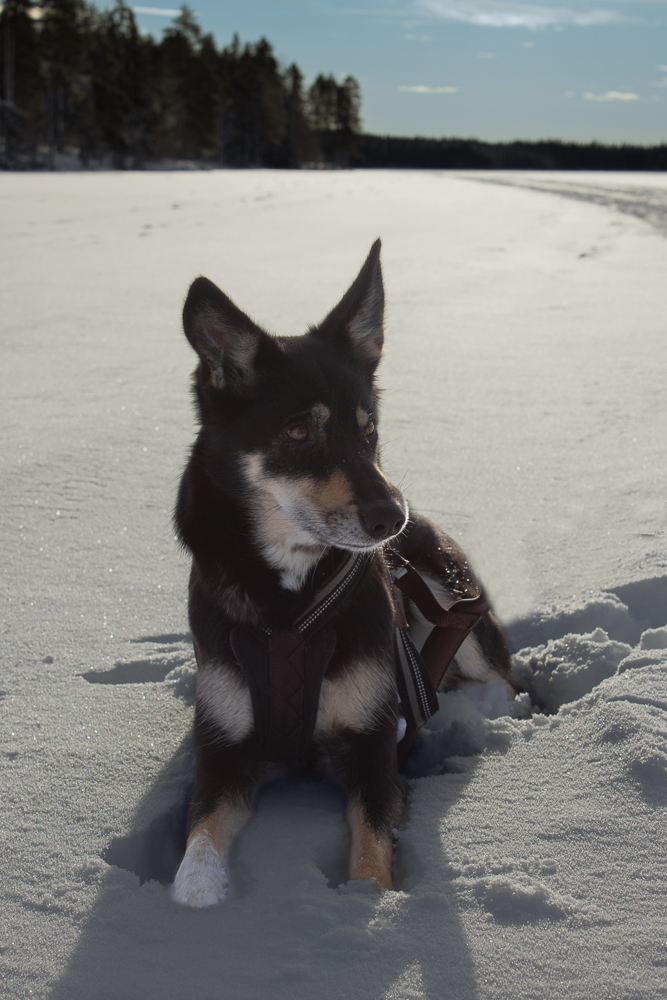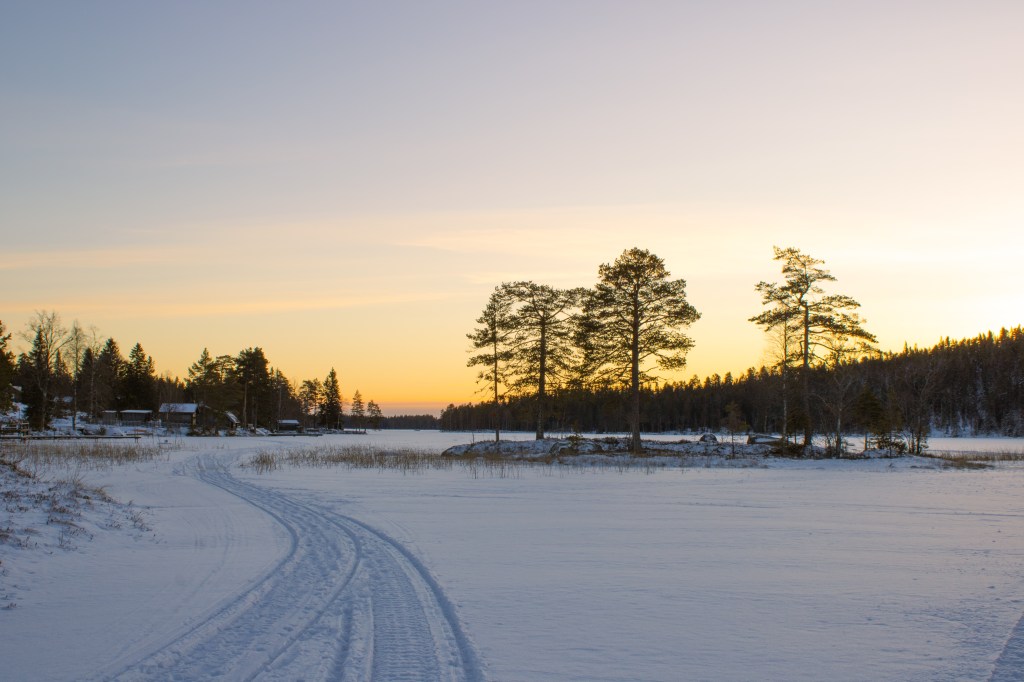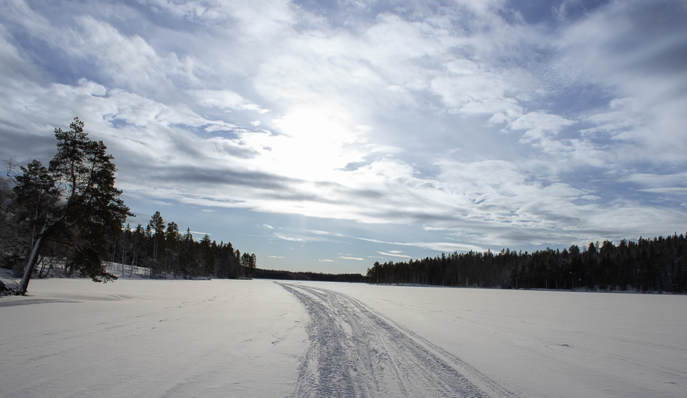 I andra änden av sjön svänger skoterspåret vänster upp genom skogen en tills man kommer till vägen som man sen följer tillbaka till bilen.