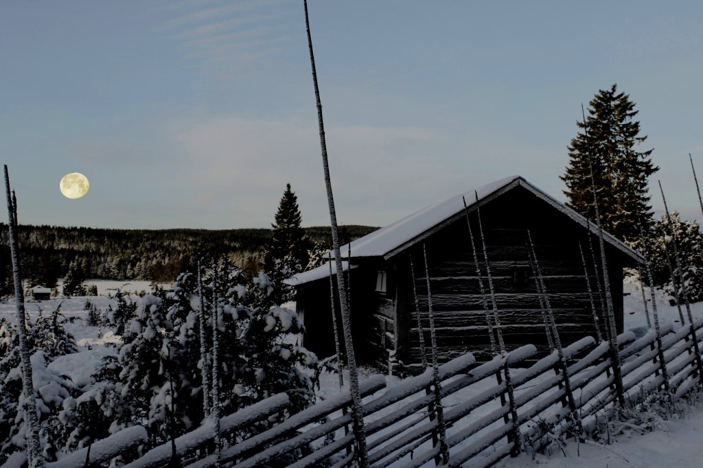 Vägen går genom den övre delen av fäboden. Står man på den och kular ut över sjön, brukar det bli ett fantastiskt fint eko mot Trollberget som ligger mitt emot.